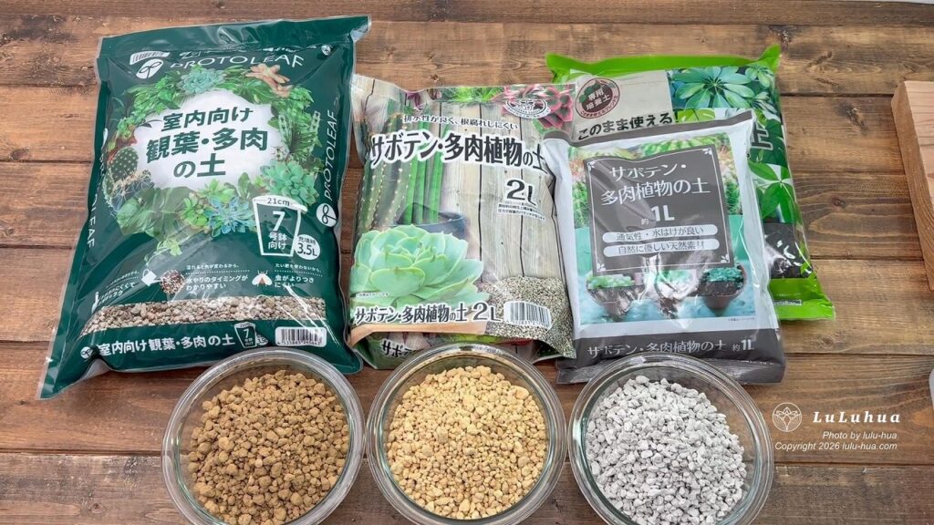 一番簡単なのは、園芸店やホームセンターで売られている「多肉植物・サボテンの土」を使うこと。